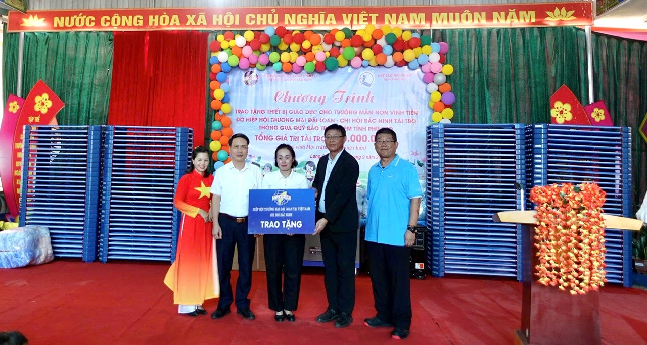 Ngày 19/9, Hiệp hội Thương mại Đài Loan chi hội Bắc Ninh thông qua Quỹ Bảo trợ trẻ em tỉnh Phú Thọ tổ chức chương trình trao tặng thiết bị giáo dục cho Trường Mầm non Vinh Tiền, xã Long Cốc.