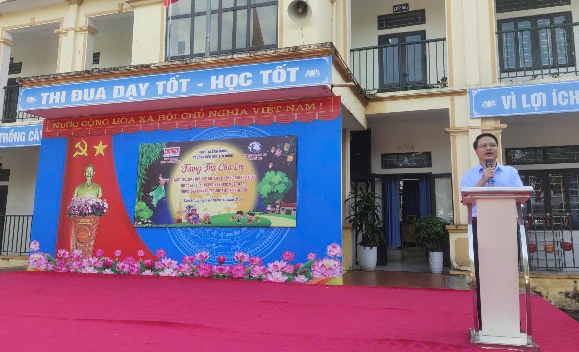 Chiều 03/10 (tức 12/8 âm lịch), Quỹ Bảo trợ trẻ em tỉnh Phú Thọ phối hợp với Công ty TNHH Công nghệ Cosmos tổ chức chương trình “Trung thu cho em” tại Trường Tiểu học Yên Đồng, xã Tam Hồng, tỉnh Phú Thọ.