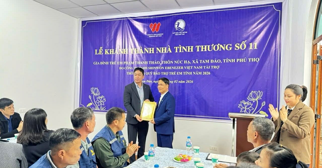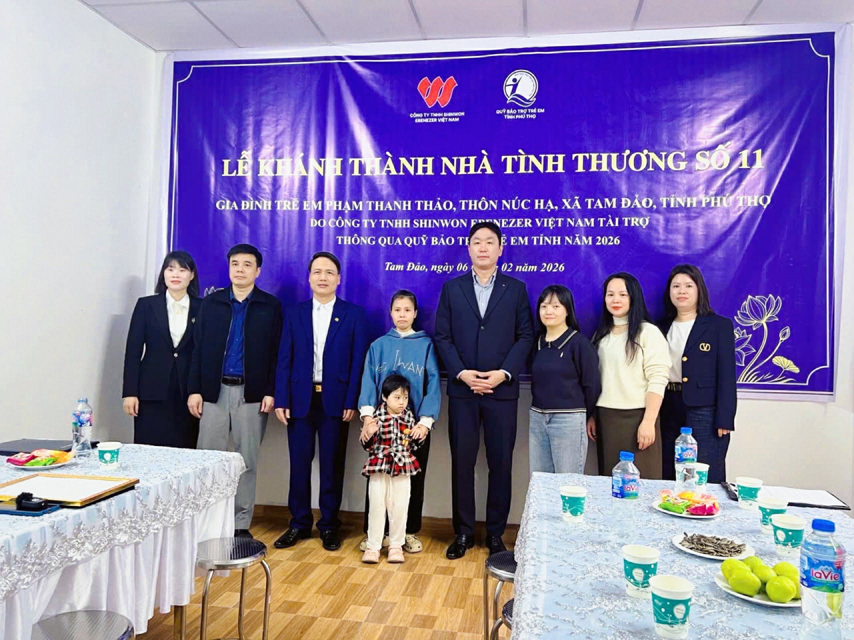 Sáng ngày 06/02/2026, Quỹ Bảo trợ trẻ em tỉnh Phú Thọ phối hợp với Công ty TNHH Shinwon Ebenezer Việt Nam và xã Tam Đảo tổ chức Lễ khánh thành và bàn giao nhà tình thương cho gia đình trẻ em Phạm Thanh Thảo sinh năm 2021 có hoàn cảnh khó khăn trên địa bàn xã Tam Đảo, tỉnh Phú Thọ.