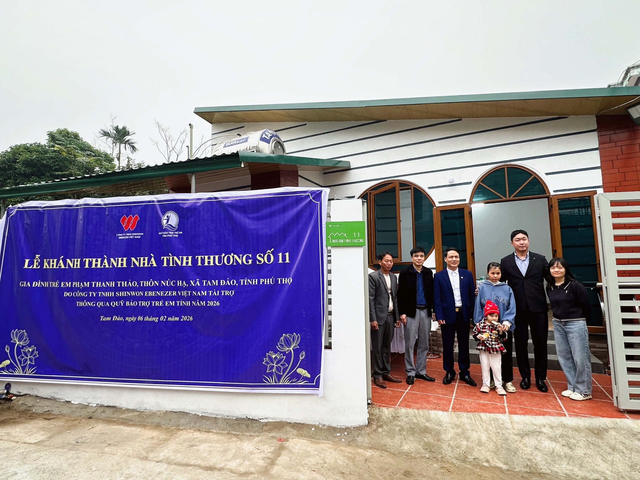 Trước hoàn cảnh đó, Công ty TNHH Shinwon Ebenezer Việt Nam thông qua Quỹ Bảo trợ trẻ em tỉnh Phú Thọ quyết định tài trợ toàn bộ kinh phí xây dựng ngôi nhà mới theo hình thức “Chìa khóa trao tay”. Sau thời gian gấp rút thi công từ ngày 05/01/2026 đến ngày 06/02/2026, công trình đã hoàn thành trong vòng 01 tháng. Căn nhà khang trang được bàn giao cho gia đình em Thảo trước thềm năm mới, giúp gia đình em an cư lạc nghiệp và đón Tết Nguyên đán Bính Ngọ trong niềm vui và sự ấm áp.